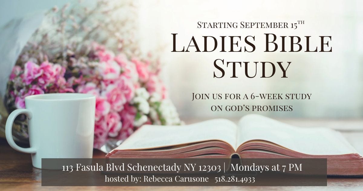 The women’s Bible study is meeting every Monday at 7 p.m. for a six-week study on God’s promises. See Rebecca or one of the ladies for more information. Next meeting: October 6.